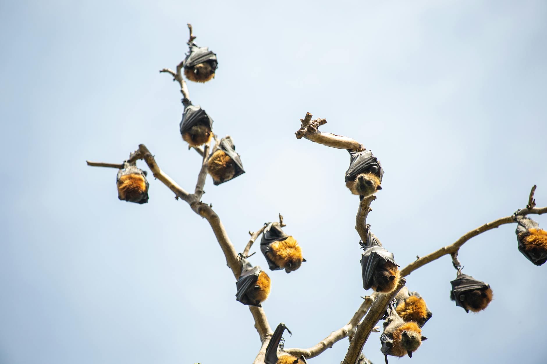 Grupa nietoperzy zwisających z gałęzi drzew w słoneczny dzień